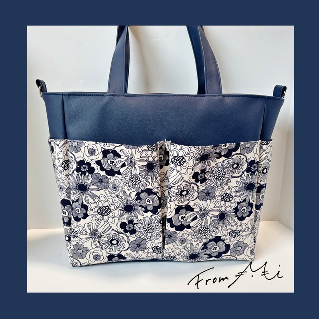 やわらかな合皮と北欧風のフラワー柄キャンバスを組み合わせた、上品で実用的なトートバッグです。 たっぷり入るA4サイズで、通勤やお出かけ、マザーズバッグとしても活躍します。 取り外し可能なショルダー紐付き! 内側のファスナーポケットは、貴重品や鍵など大切なものの収納に最適です。 底板、底鋲付きで自立しやすく、傷や汚れから守ります。 すべて丁寧に手作業で仕上げており、丈夫さとデザイン性を両立しています。 • PCや書類をたくさん入れても、底板が入っているのでバッグの形が崩れずスマートにお持ちいただけます。 • 満員電車などで座れない時も、底鋲がついているため、床に置いても生地が汚れたり傷つくのを防ぎます。 • 内側のファスナーポケットは、貴重品や鍵など大切なものの収納に最適です。 ・サイドのポケットには500mlのペットボトルや折りたたみ傘も入れられます。 サイズ ・縦約32cm×縦横35cm×マチ14cm (持ち手約58cm) ・ショルダー紐 約60cm~120cmまで調節可能 素材 • 本体:合成皮革(ネイビー) • ポケット部分:コットンキャンバス(花柄) • 裏地:コットン • 金具:シルバー(底鋲・ファスナー・Dカン) 特徴 ・A4対応&大容量 ・底鋲付きで安定感◎ ・すべて丁寧に手作業で仕上げておりますため、若干の個体差があります。ご了承ください。 ・汚れた場合は、柔らかい布で軽く拭き取ってください。 直射日光や高温多湿を避けて保管してください。