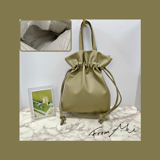 人気の巾着バッグをショルダーバッグとしても使えるように改良しました! 着脱可能なショルダー紐でさらにファッションの幅が広がります(˶'ᵕ'˶) . . コンパクトなイメージのある巾着バッグ。 マチをつけたことにより、収納力をアップさせました。 約 縦30cm×横27.5cmの見た目のコンパクトさはそのままに、500mlのペットボトルを入れても余裕のあるデザインです。 . 内側には明るい布を使用し、物を見やすいようにしました。 さらに内ポケットをつけることで、バッグの中で見失いがちなリップや鍵、カードなどを入れられるようにし、無くしそうなものもしっかり収納でき、見つけやすい。 . 持ち手はもちろん、巾着紐とショルダー紐もバッグ本体と同一素材で製作しているため、統一感のある仕上がりです。 . 合皮素材を使用しているため、本革の素材感を保ちつつ、柔らかくて軽い、そして汚れにくくなっています。 合皮は水を弾きやすいため、雨の日でも気にせず持ち歩くことができます。 . 〈商品詳細〉 カラー:グリーン サイズ:約H30×W27.5×D6(cm) 持ち手:約32cm 内ポケット:約H16×W23 ショルダー:約150(cm) 素材:合皮 一つ一つ手作業で制作しているため、サイズや色に多少の誤差があります。ご了承ください。 ご購入前に必ず注意事項をお読みください。 【ご購入時の注意点】 ○1つ1つ手作業で製作しているため、色や形に若干の差が出てしまう場合があります。 ○実際の色味に近づけて撮影していますが、撮影する場所やお使いの端末により、色味が微妙に異なって見える場合があります。 ○お客様都合による返品はご遠慮ください。万が一お届け商品に破損・不備等ありました場合は、商品到着後3日以内にご連絡下さい。 尚、発送過程における破損に関しては一切の保証は出来かねます。 ○宛先不明、住所誤記載等で商品が戻ってきた場合は、着払いにて再度発送させていただきます。 ○商品の発送はお客様のご入金が確認でき次第2~3日程度で発送させていただきます。 ここまでご覧頂きありがとうございます。 ご質問等ありましたら、お気軽にお問い合わせ下さい。 〈その他〉 ✔️Instagramアカウントでは試作品や新商品についてなどの発信をしていますので、見逃さぬよう是非フォローを! @from_mi_official