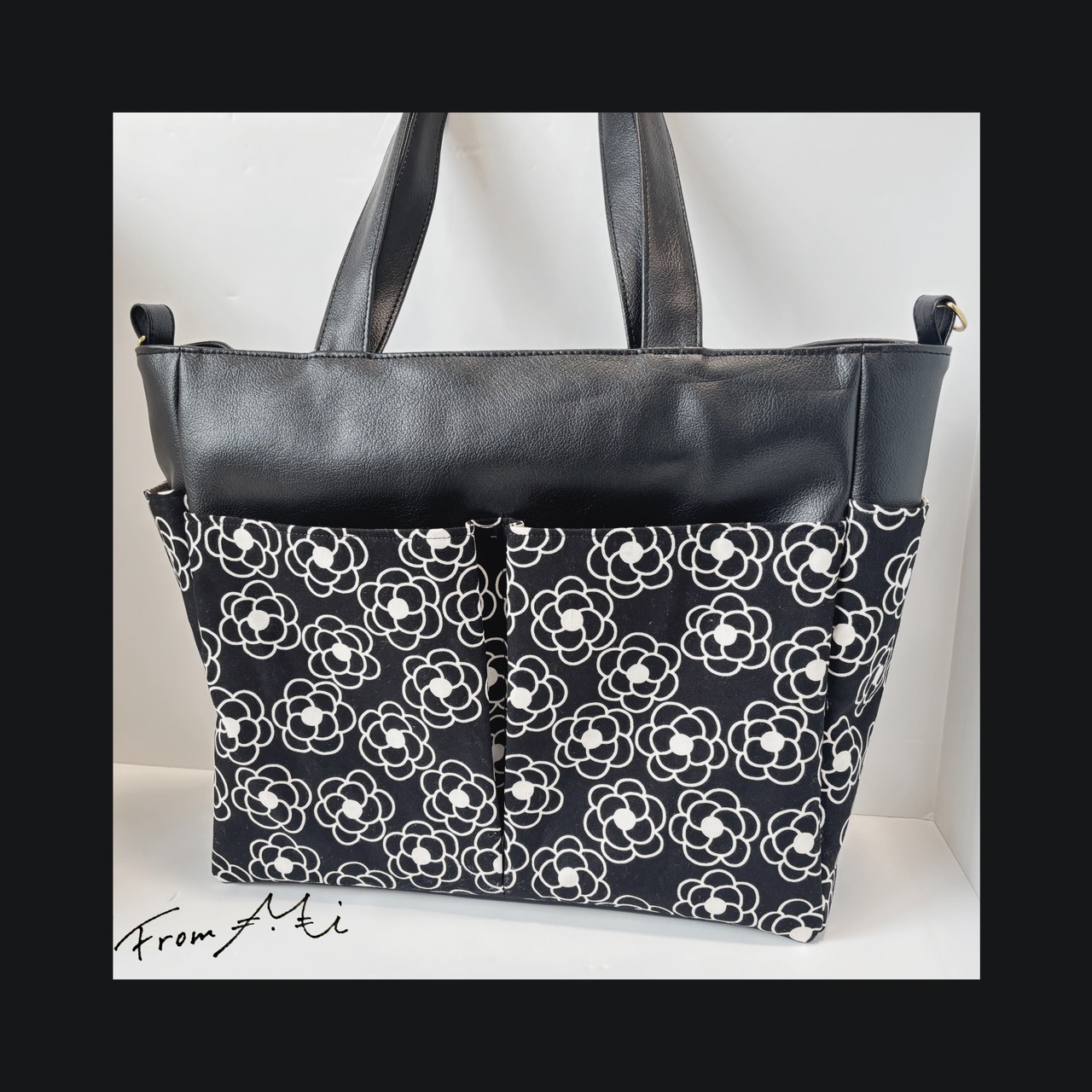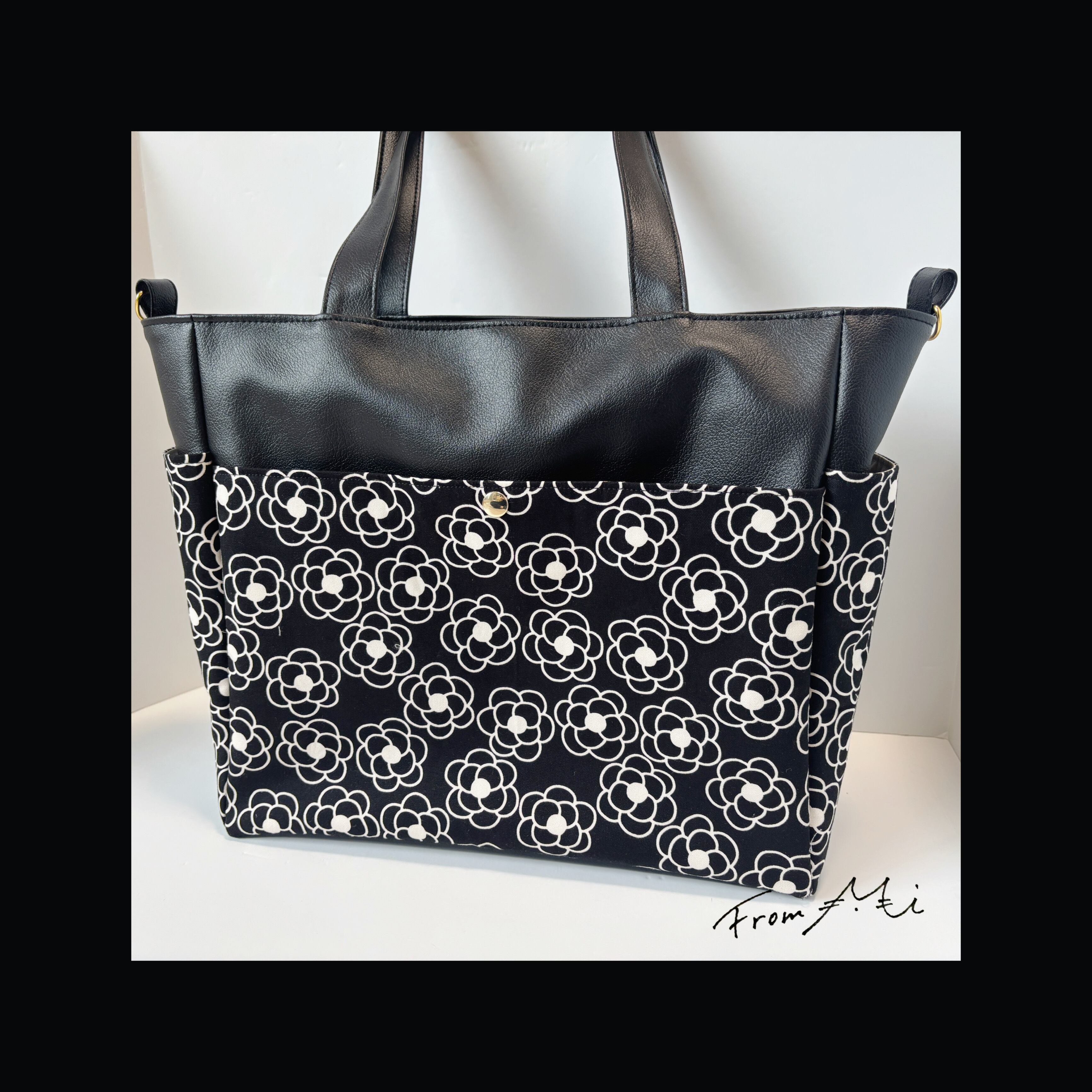 やわらかな合皮と北欧風のフラワー柄キャンバスを組み合わせた、上品で実用的なトートバッグです。