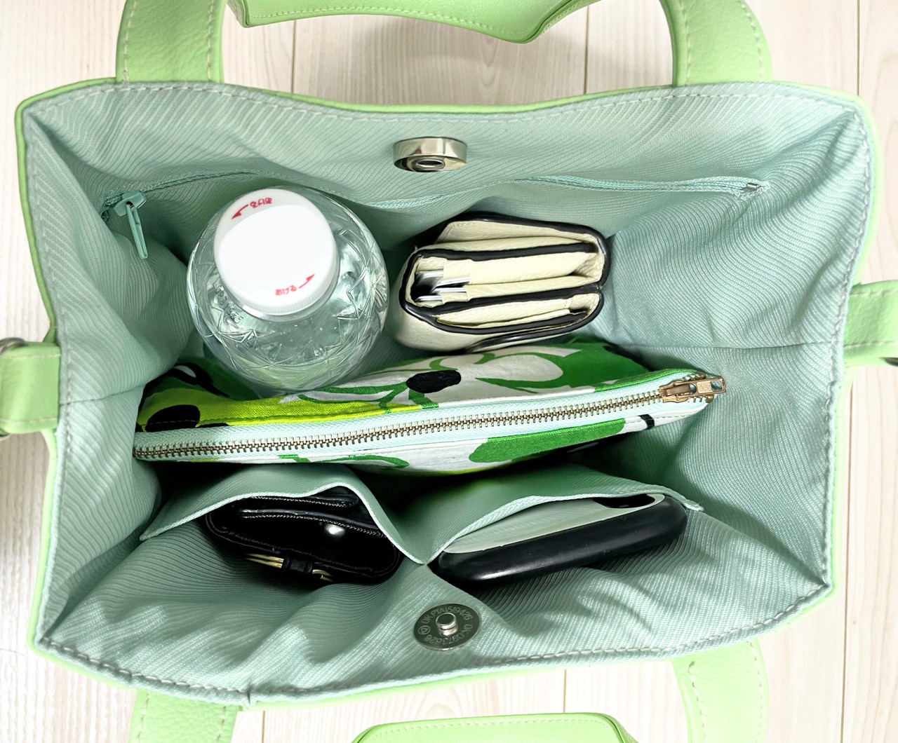 スマホやポータブル充電器、リップなどの小物も仕分けやすいポケットが2つ。