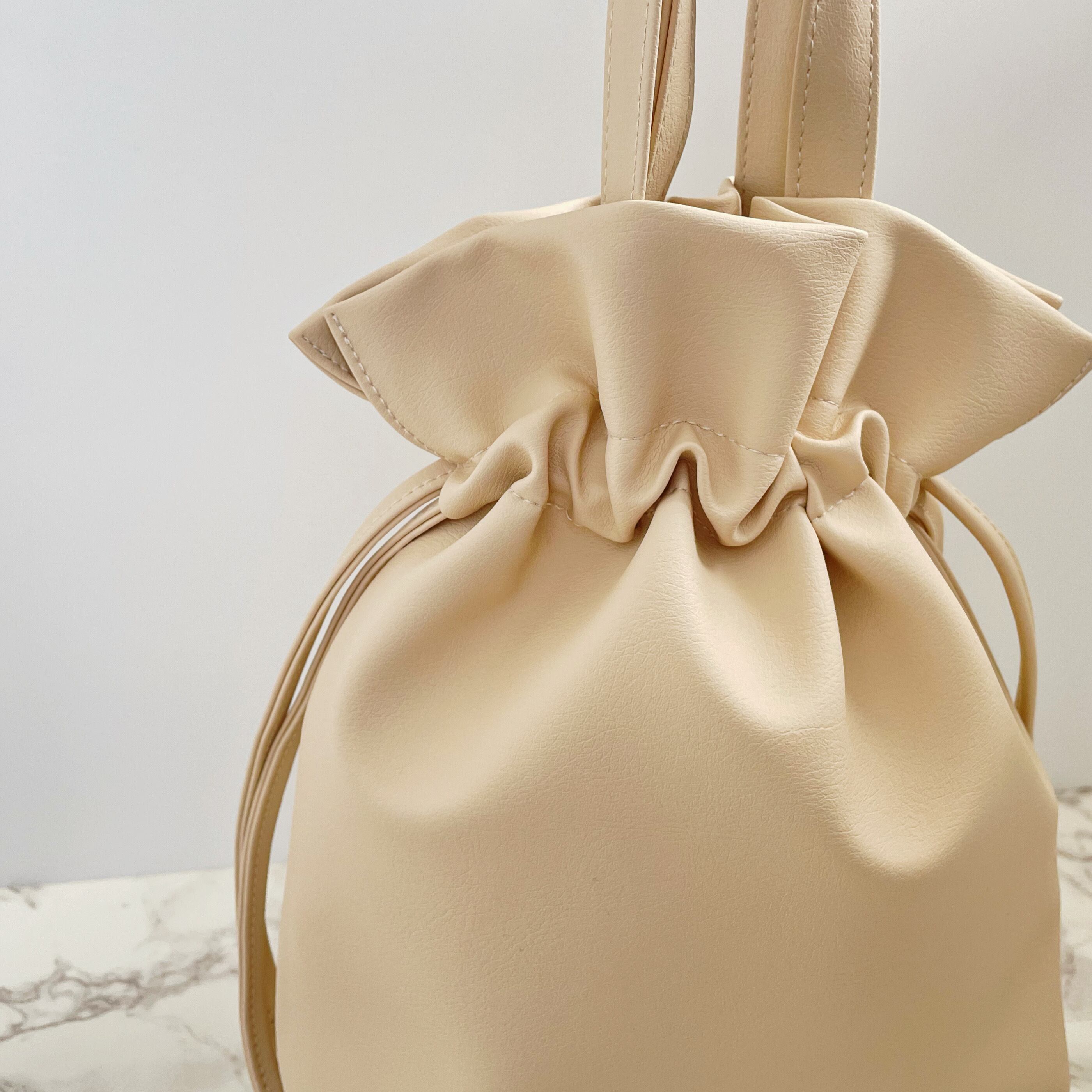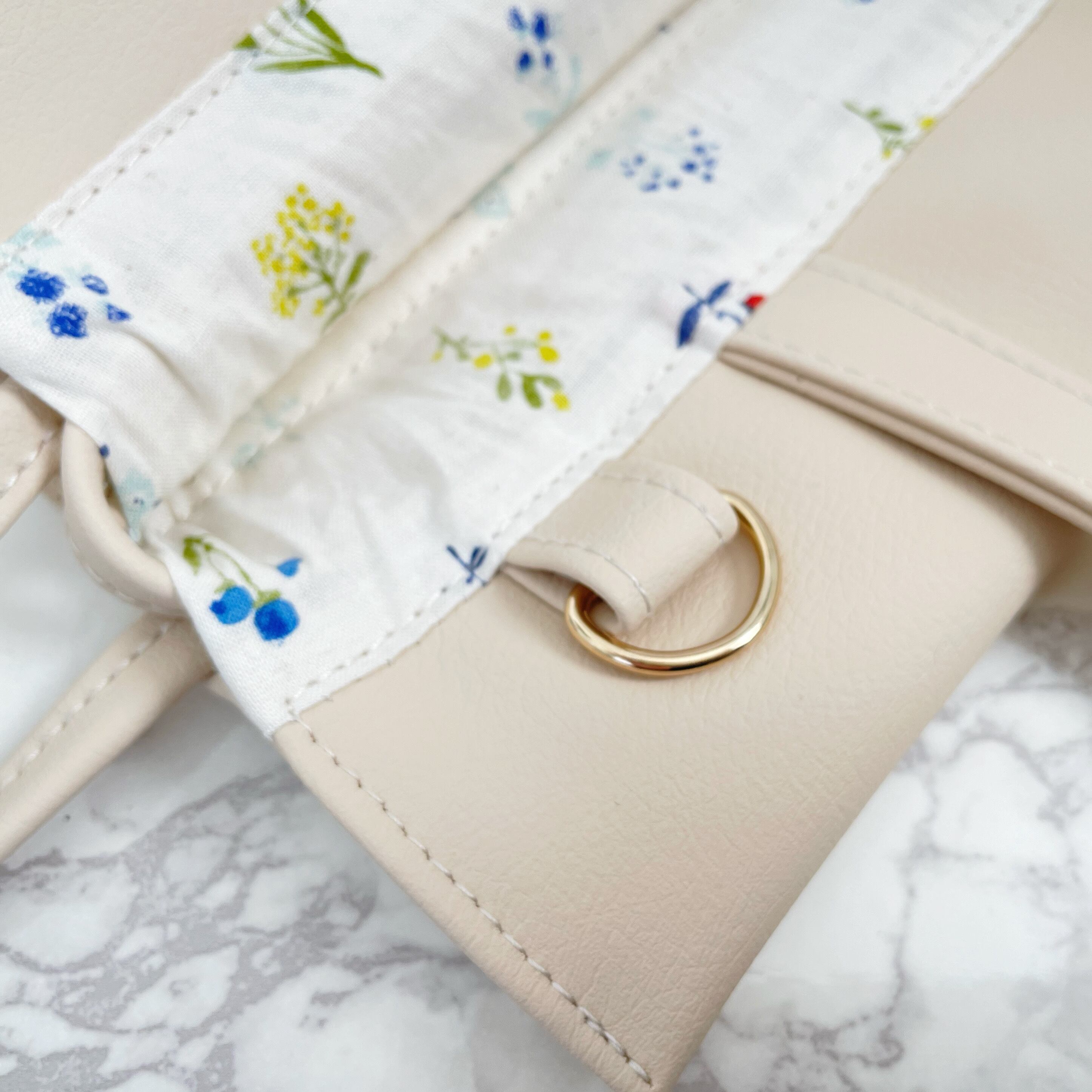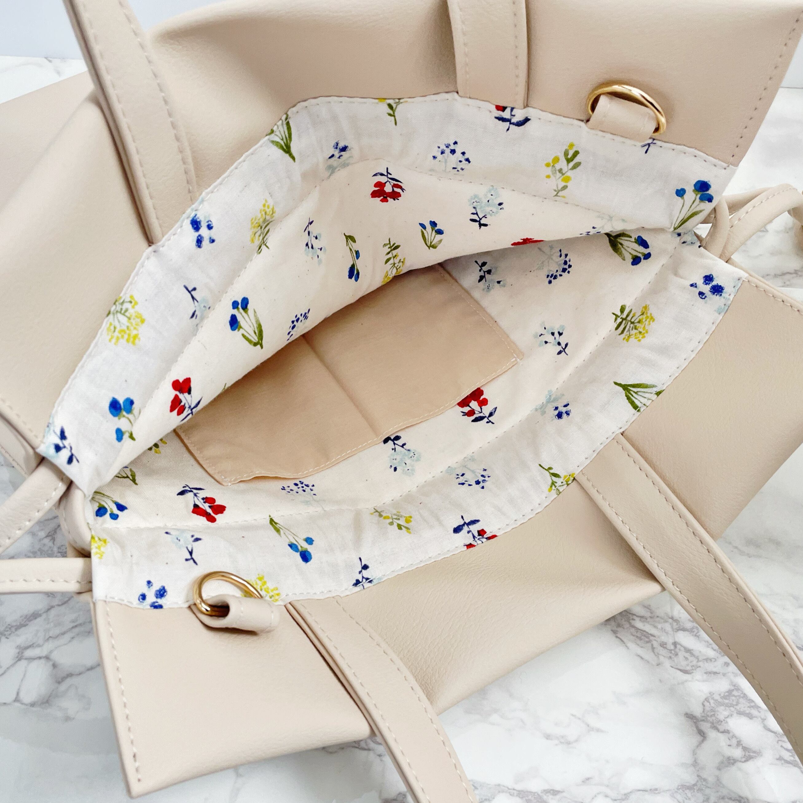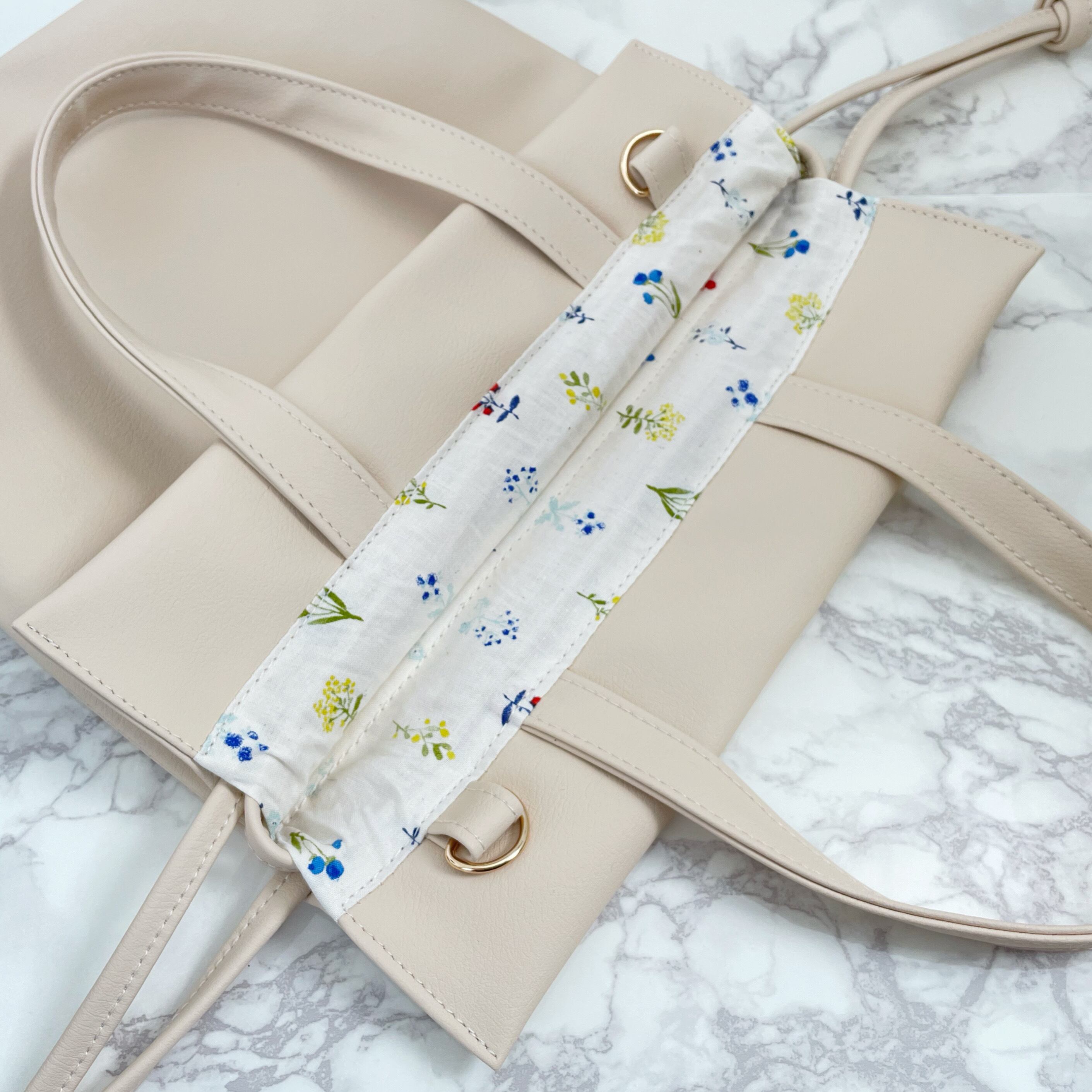 持ち手はもちろん、巾着紐とショルダー紐もバッグ本体と同一素材で製作しているため、統一感のある仕上がりです。
