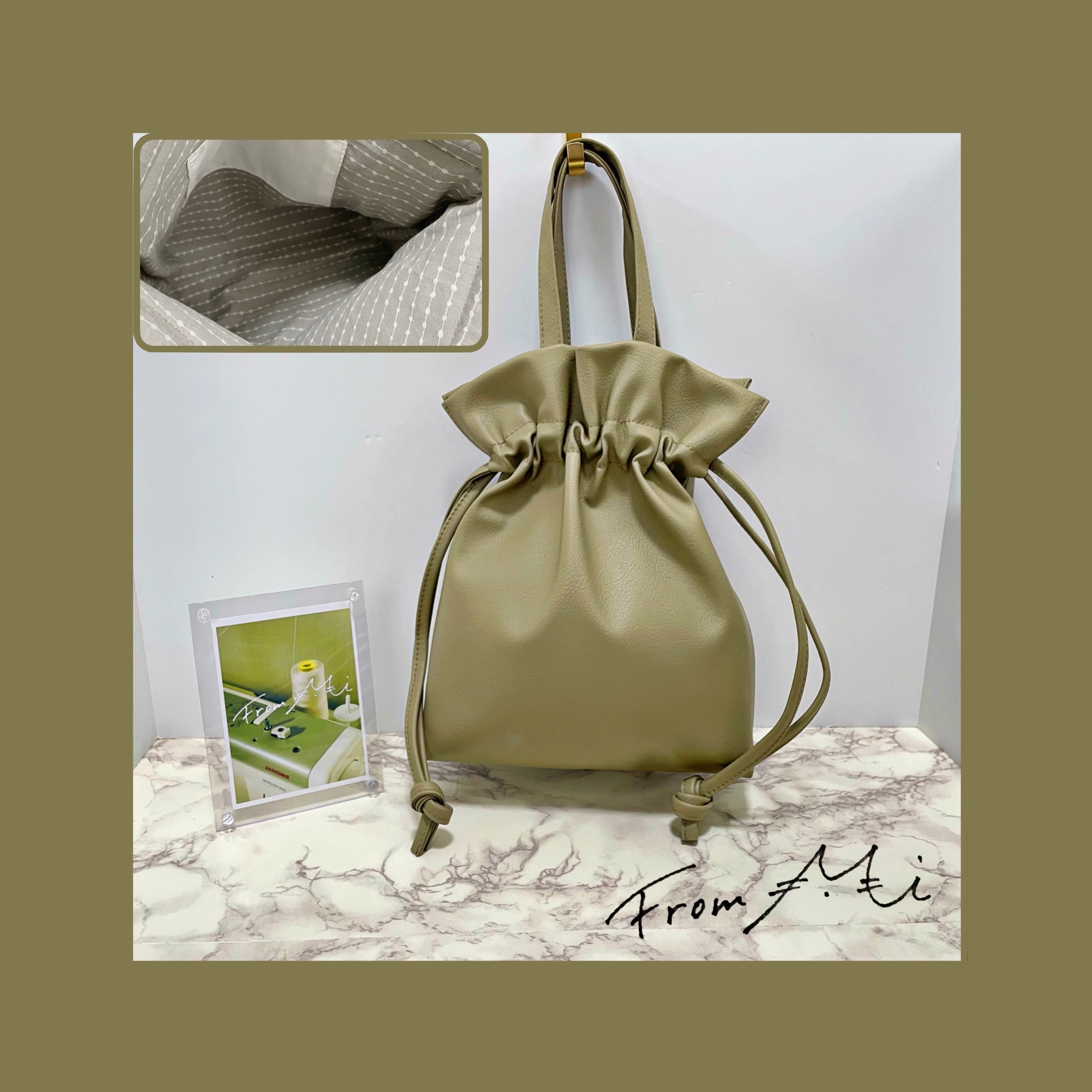 持ち手はもちろん、巾着紐とショルダー紐もバッグ本体と同一素材で製作しているため、統一感のある仕上がりです。